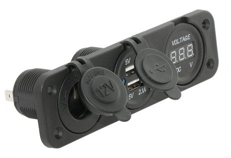 Гнездо прикуривателя (для подлючения электроприборов), два зарядных гнезда USB и цифровой вольтметр, объединенные в одной пластиковой панели. Могут также устанавливаться отдельно без панели.