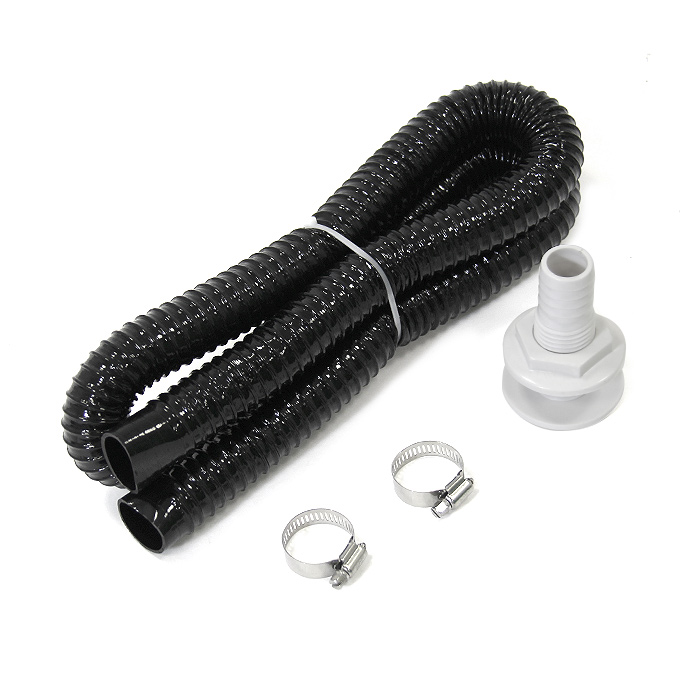 В комплекте идет пластиковый шланг диаметром 25 мм и длиной 1,56 м, а также пластиковый патрубок диаметром 25 мм и два хомута из нержавеющей стали размером 19-29 мм.