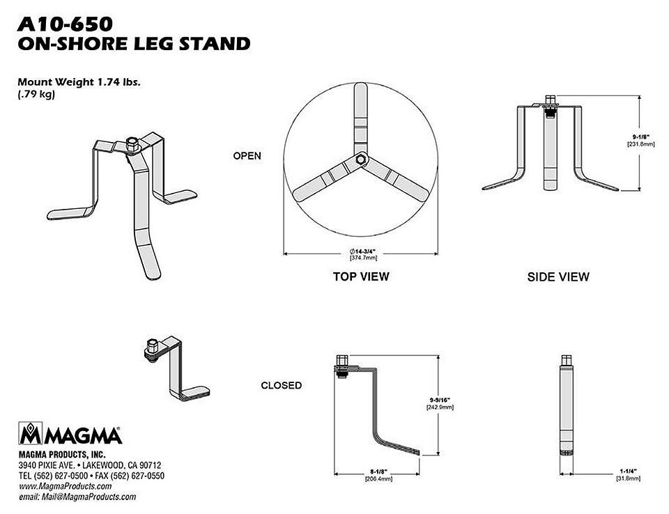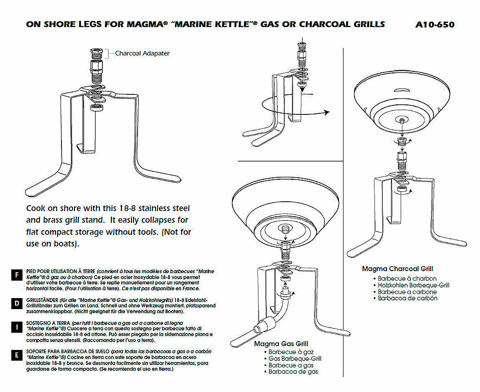 Подставка из нержавеющей стали и латуни для использования любых круглых грилей Magma на берегу. Позволяет надежно установить гриль на земле или любой другой плоской поверхности. Легко разбирается до плоского состояния без использования инструментов.