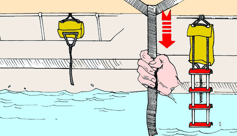 Аварийный трап складной конструкции. Закрепляется в сложенном виде в специальной сумке (в комплекте) в районе кормы судна. Всегда готов к действию (человек, оказавшийся за бортом, легко разложит его, потянув за шнурок), но вместе с тем не занимает много места и не волочится за судном по воде.