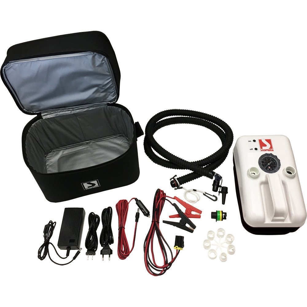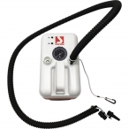 Компактный малошумный воздушный насос. Развиваемое им давление (до 1,5 Бар) позволяет накачивать любые надувные изделия, включая лодки с пайолами высокого давления, кайты и SUP-доски. Автоматическое отключение по достижении заданного давления. Питание - от гнезда прикуривателя. Имеется также версия со встроенным аккумулятором, позволяющая пользоваться насосом автономно от источников питания. Максимальное давление: 1,5 Бар. Потребляемый ток: 9 А (12 В). Производительность: 150 л/мин. Размеры (в сумке): 20 x 32 x 22 см. Вес: 6,65 кг. Производитель: «Scoprega», Италия.