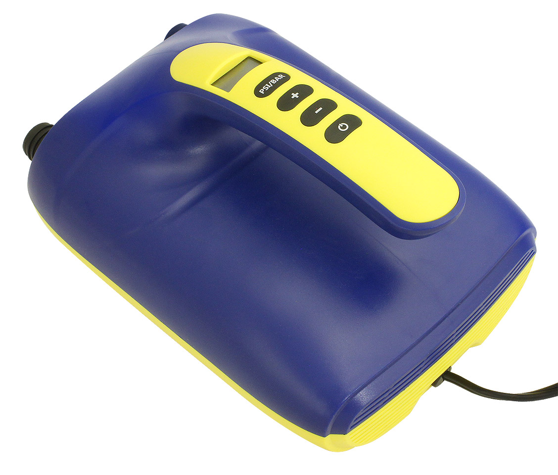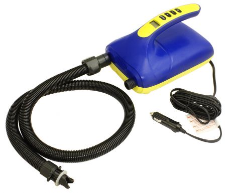 Универсальный воздушный насос с цифровым управлением. Развивает давление от 5 до 1380 мБар, благодаря чему его можно использовать для накачивания широкого спектра надувных изделий - от пляжных аттракционов и буксируемых баллонов ("ватрушек") до надувных лодок (в том числе лодок с пайолами высокого давления), SUP-досок и кайтов, требующих высокого давления. Выбор необходимого давления (при достижении которого насос отключится автоматически) производится путем нажатия кнопок, выбранное давление отображается на ЖК-дисплее. Есть возможность выбора единиц измерения (доли Бара или фунты на квадратный дюйм - PSI). Насос двухступенчатый, сочетает в одном корпусе высокопроизводительный центробежный насос, быстро нагнетающий основной объем воздуха при давлении около 5 мБар и поршневой насос, который доводит давление до выбранного пользователем значения. Насос комплектуется кабелем питания со штекером под гнездо прикуривателя лодки или автомобиля. Имеется возможность автономной работы насоса, для чего следует дополнительно приобрести батарейный блок (арт. 10263810).