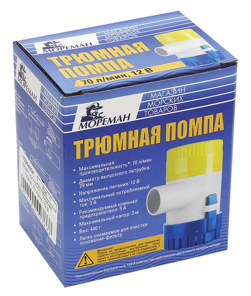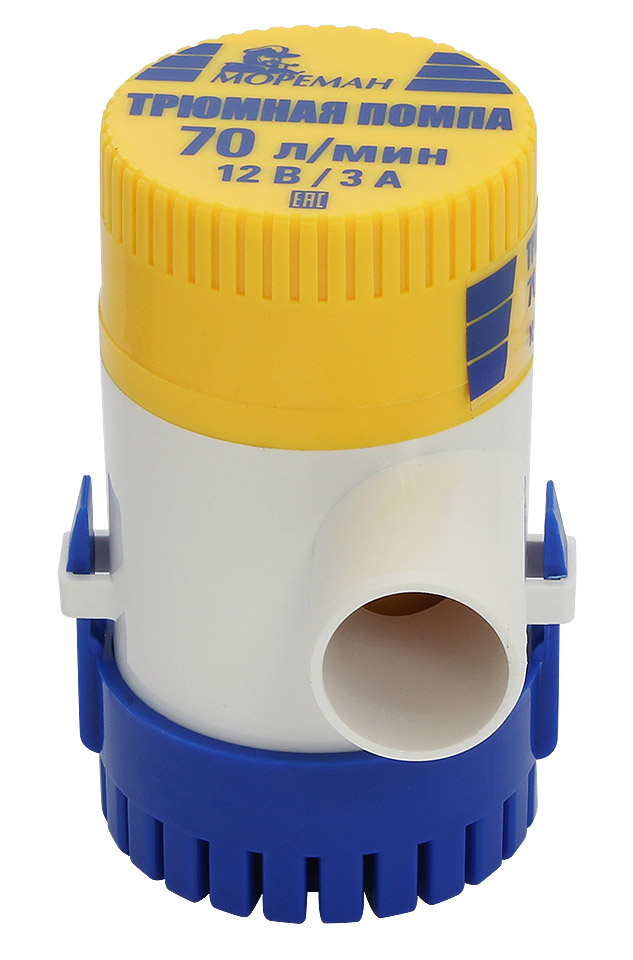 Электрическая трюмная помпа производительностью 70 л/мин*. Применяется для откачки трюмной и подсланевой воды. Включается по мере необходимости владельцем судна или по мере поступления воды автоматическим выключателем (приобретается отдельно). Съемное основание-фильтр.