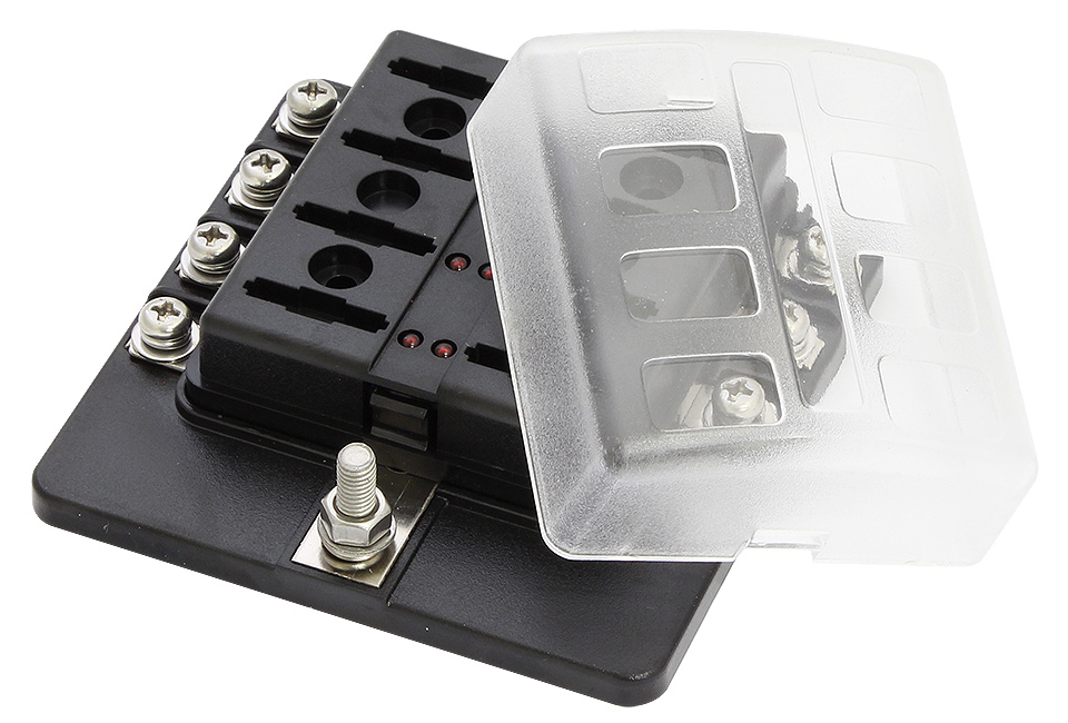 Держатели для предохранителей флажкового типа (иные названия: автомобильные штыревые, ножевые, плоские предохранители). На 8 цепей (максимальный ток до 30А на цепь). Каждая цепь снабжена красным светодиодным индикатором, загорающимся в случае сгорания предохранителя. Подключение потребилителей - винты с резьбой М5.