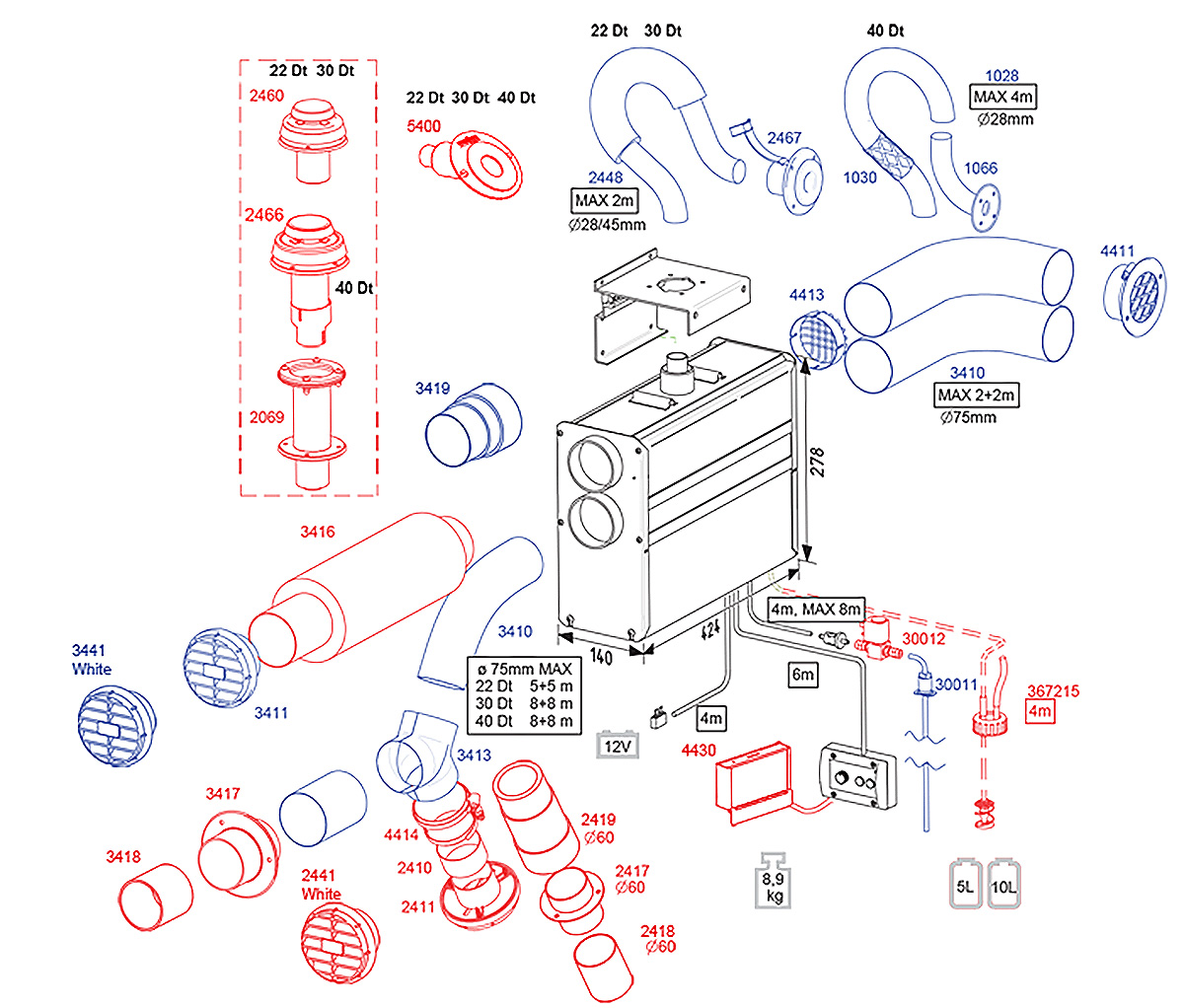 Полностью автоматический автономный отопитель с регулируемой тепловой мощностью (также может использоваться в качестве вентилятора). Идеальное решение для судна с дизельным двигателем (нет необходимости иметь на борту второй вид топлива). Горение полностью автоматизировано – запуск и гашение осуществляется переключением тумблера. Встроенный подкачивающий насос обеспечивает бесперебойную подачу топлива из внешнего бака. Оборудован встроенной защитой от аварийного перегрева. Снабжен патрубком вывода горячего воздуха, который с помощью гибких металлорукавов может быть подведен в любое помещение судна на расстояние до 5 м. Длина выхлопного шланга может составлять 2 м. Отопитель практически бесшумен и может устанавливаться непосредственно в жилых помещениях судна.