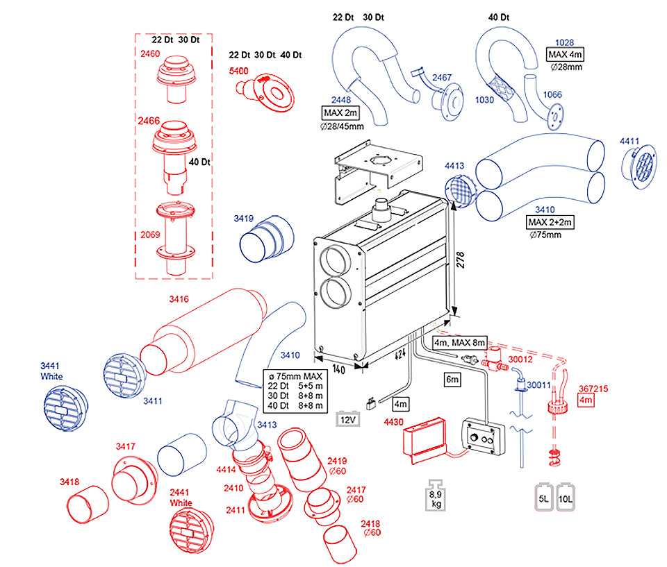 Идеальное решение для судна с дизельным двигателем (нет необходимости иметь на борту второй вид топлива). Горение полностью автоматизировано – запуск и гашение осуществляется переключением тумблера. Встроенный подкачивающий насос обеспечивает бесперебойную подачу топлива из внешнего бака. Оборудован встроенной защитой от аварийного перегрева. Снабжен патрубком вывода горячего воздуха, который с помощью гибких металлорукавов может быть подведен в любое помещение судна на расстояние до 8 м. Длина выхлопного шланга может составлять 2 м. Отопитель практически бесшумен и может устанавливаться непосредственно в жилых помещениях судна.