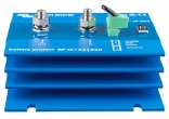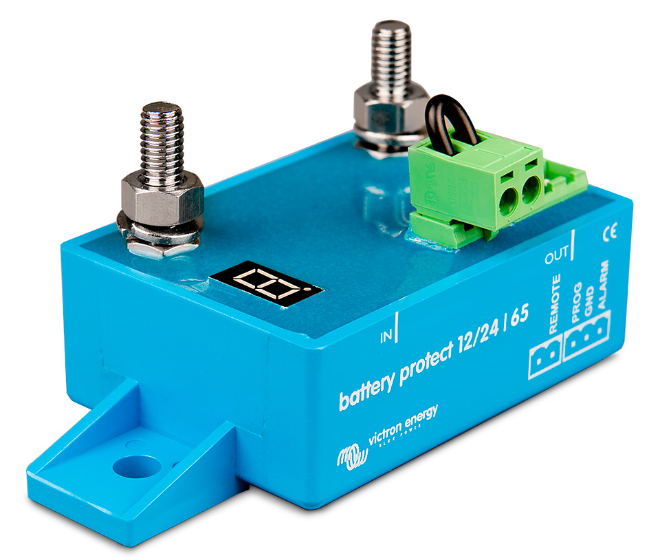 Устройства для защиты аккумуляторных батарей от чрезмерного разряда. Отключают нагрузку при достижении напряжения аккумуляторной батареи заданного пользователем уровня, предохраняя, таким образом, батарею от повреждения, вызванного глубоким разрядом и(или) сохраняя в ней заряд, достаточный для запуска двигателя. Уровень напряжения отключения задается переключателями на корпусе устройств и отображается на дисплее. Совместимы как с традиционными свинцово-кислотными, так и с литиевыми батареями. Отличаются чрезвычайно низким собственным энергопотреблением. Обеспечивают защиту от перенапряжения - нагрузка будет автоматически отключена если напряжение на батарее по каким-то причинам поднимется до 16 В или 32 В (при номинале 12 В или 24 В). Возможность подключения световой или звуковой сигнализации о падении напряжения ниже заданного уровня (имеет 12-секундную задержку, таким образом кратковременное падение напряжения во время запуска двигателя не приведет к срабатыванию сигнализации). 1,5-минутная задержка отключения для предотвращения ложных срабатываний. Напряжение питания: 6-36 В. Максимально коммутируемый ток (продолжительно): 65, 100, 220 А. Максимально коммутируемый ток (в течение 30 секунд): 250, 600, 600 А. Потребляемый ток (нагрузка включена/нагрузка выключена): 1,5/0,6 мА. Уровень защиты: IP67. Производитель: "Victron energy".