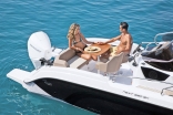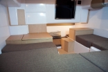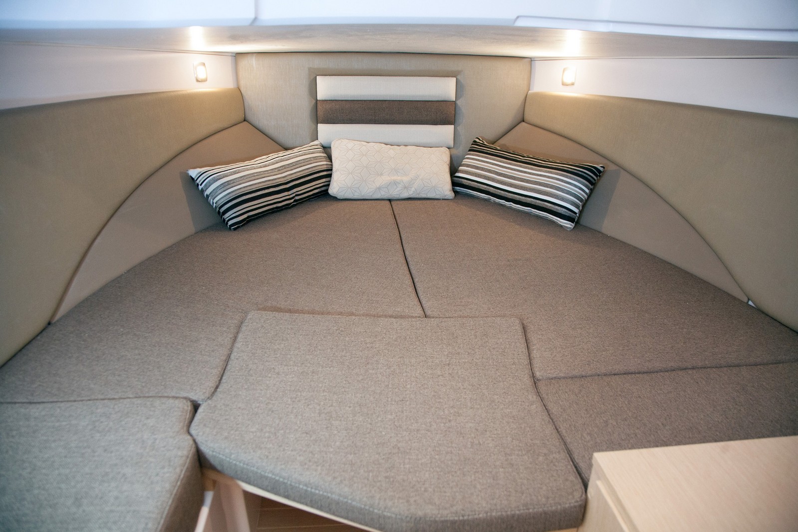Ветровое стекло рулевой консоли обеспечивает необходимую степень защиты, неутяжеляя общий профиль лодки. На эргономичной приборной панели есть место длямонитора современного картплоттера, датчиков двигателя и других приборов. Передрулевой консолью стоят два кресла (для пилота и штурмана) с болстерами иразнообразными регулировками, которые при необходимости разворачиваются кмягкому дивану в кокпите, образуя уютную обеденную зону: для нее предусмотренопциональный съемный столик. Диван в корме можно трансформировать еще в однуплощадку для загорания.