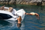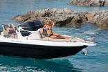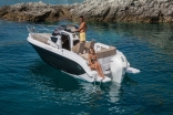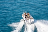 На транце этой модели могут стоять подвесные моторы (1 или 2) мощностью от115 до 250 л.с. Как показывают результаты теста с одним Mercury V6 мощностью 200л.с., лодка выходит на глиссирование уже на скорости 11 узлов (ок. 2800об/мин), максимальная скорость (5700 об/мин) достигает 39 узлов даже в условияхморского волнения до 2 баллов. Дальность плавания в этом режиме – 130 миль (с10% запаса топлива), а на круизной скорости 25 узлов (3500 об/мин) онавозрастает до 190 миль. При установленном на конкретном катере моторе Honda 250л.с. скорость составит 42+ узлов (до и даже более 80 км/ч).