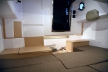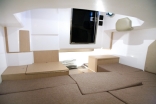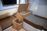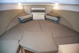 Тонированная сдвижная дверь в рулевой консоли ведет в носовую каюту на двоихвзрослых. Следует отметить, что высокое расположение рулевой консоли надуровнем кокпита позволило разместить под палубой еще одно спальное место --небольшую поперечную койку для ребенка-подростка. В каюте, отделаннойвысококачественными материалами, есть место для установки химического туалета(важно!) и достаточно места для вещей в рундуках.