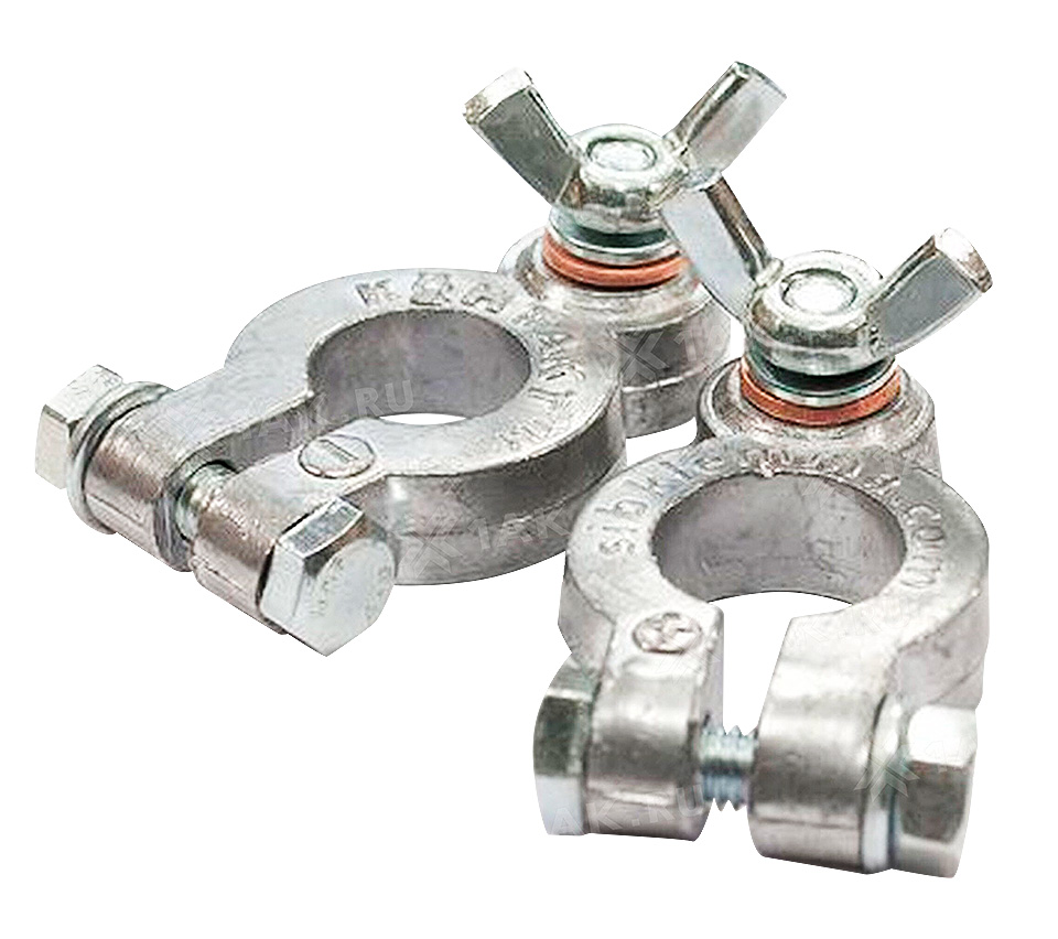 Клеммы для аккумуляторной батареи с винтовыми зажимами и гайками-барашками для крепления электрических кабелей.