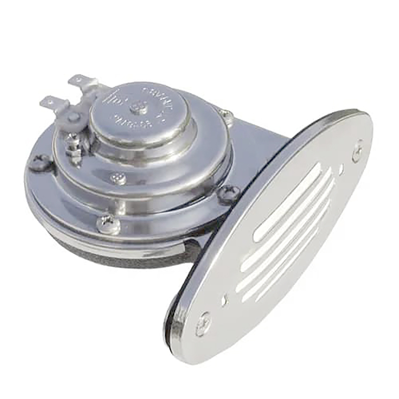 Горн электро-механический врезной низкий тон. Изготовлен из нержавеющейстали. Устанавливается в корпус катера. Комплектуется защитной решеткой суплотняющей прокладкой, 2-мя нержавеющими шурупами и проводом для подключениядлиной 30 см.