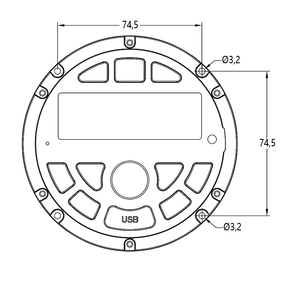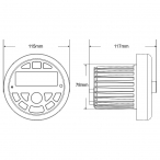 Размеры: диаметр панели управления -112 мм, толщина панели управления – 25мм, глубина корпуса от основания панели управления – 75мм, диаметр корпуса – 70мм