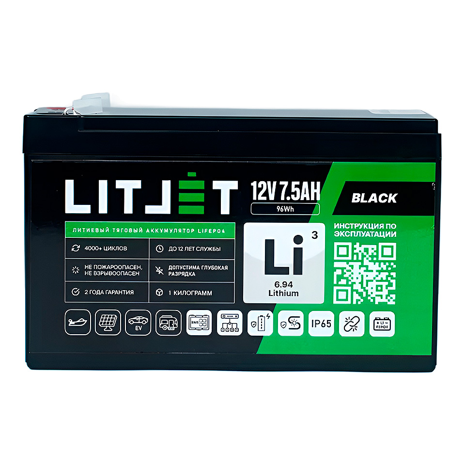 Аккумулятор тяговый LITJET BLACK LiFePO4 12V 7,5Ah 96Wh используется для ИБП, охранных систем, эхолотов, детских автомобилей.