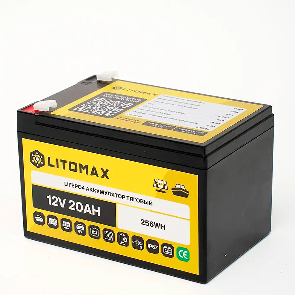 Литий железо-фосфатный аккумулятор (LiFePO4) тяговый LITOMAX с зарядным устройством 12В 2А, имеет напряжение 12 вольт, и ёмкость 20 Ач, предназначен для работы в глубоких циклах разряда и заряда. Не может быть использован для запуска ДВС. Относится к тяговым аккумуляторам.