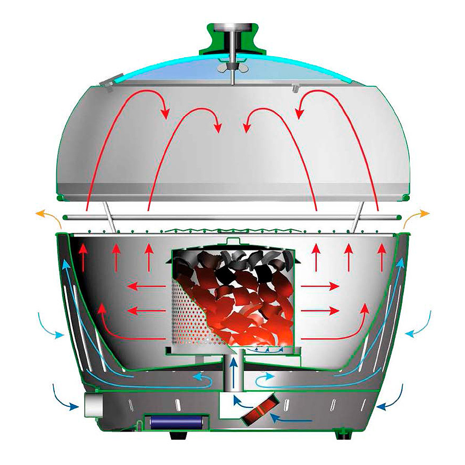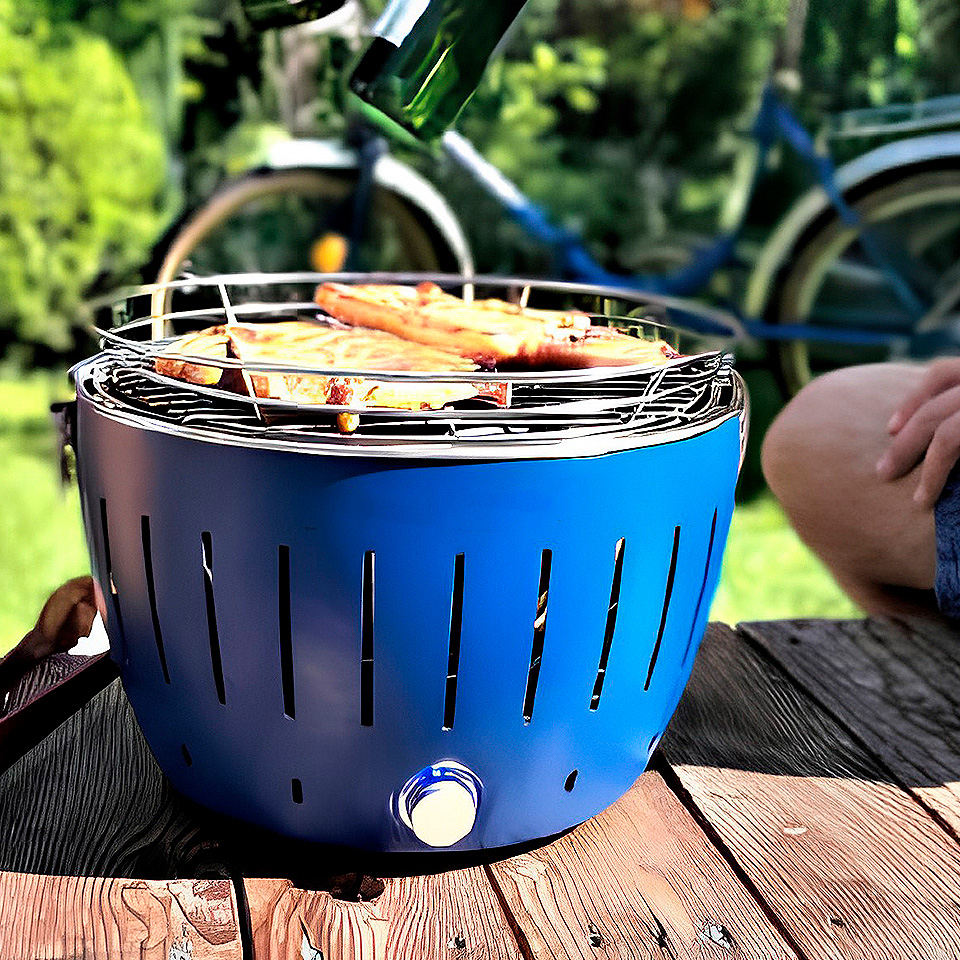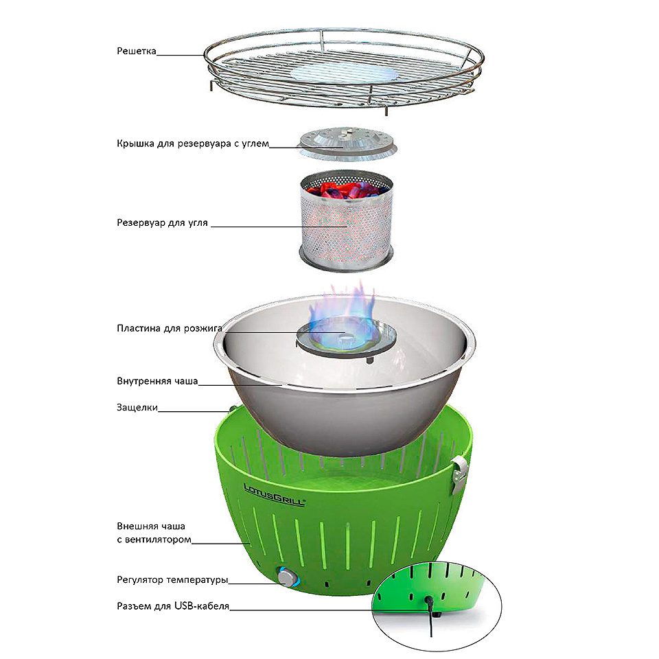 LotusGrill оснащен встроенным вентилятором, с питанием отбатареек или по USB кабелю, обеспечивающим подачу свежего воздуха к углю. Врезультате угли имеют постоянный доступ к воздуху, что обеспечивает практическибездымное разжигание гриля.