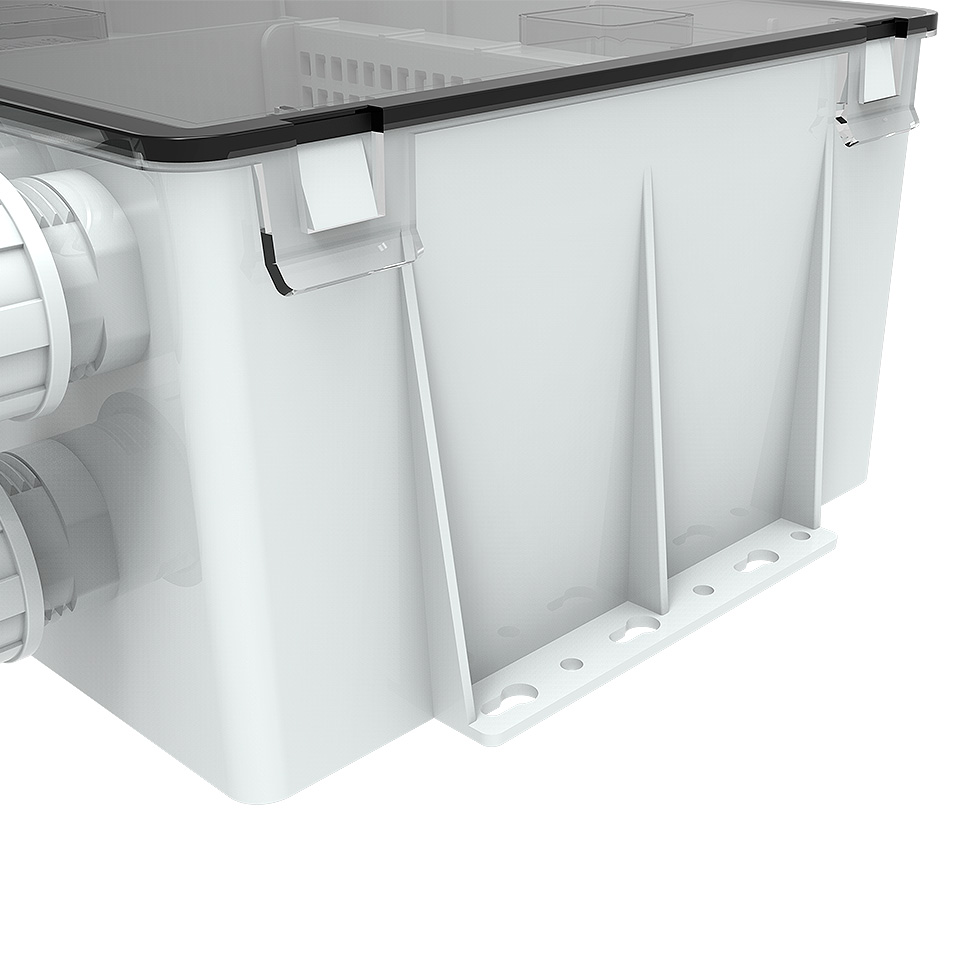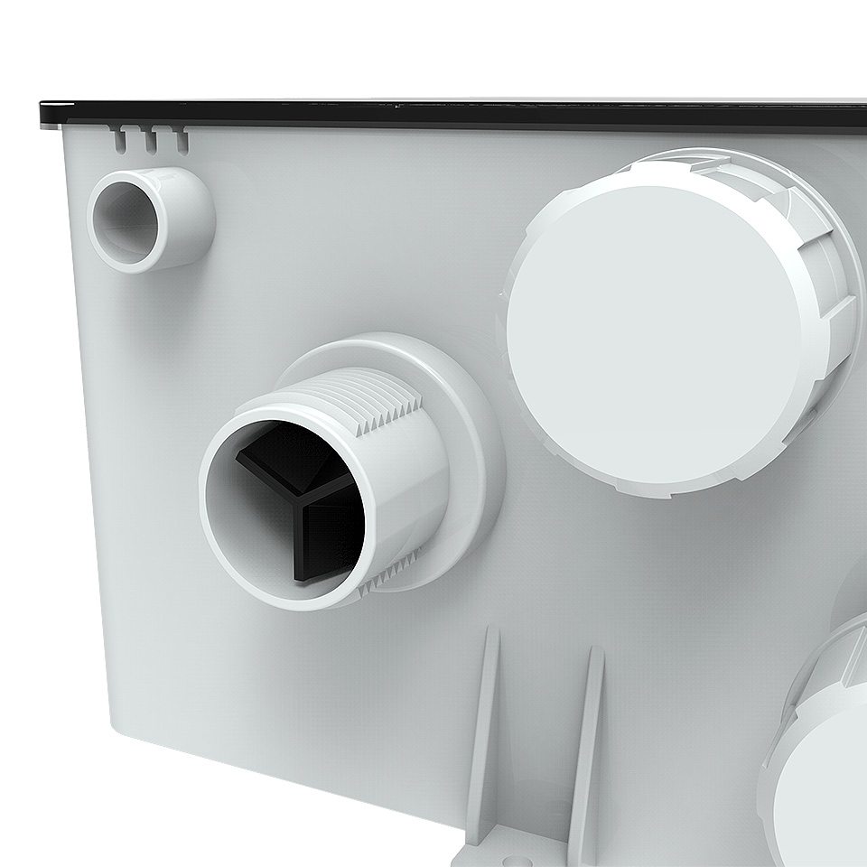 Промежуточный пластиковый бак для слива воды из раковины, душа и т.д. Применяется в случаях, когда из-за недостатка места невозможно достаточно низко разместить сточный бак необходимого объема. Стекающая вода попадает в бак по нескольким шлангам (бак имеет 3 впускных штуцера разного диаметра), а затем с помощью установленной в баке трюмной помпы с поплавковым выключателем удаляется в накопительный сточный бак достаточного объема, высота установки которого при такой схеме уже не имеет особого значения. Снабжен легко очищаемым фильтром и прозрачной крышкой. Невозвратный клапан предотвращает обратное поступление воды в бак самотеком. Бак поставляется в комплекте с автоматической (встроенный поплавковый выключатель) помпой производительностью 75 литров в минуту*. Штуцеры для подключения шлангов диаметром 19, 25 и 29 мм.