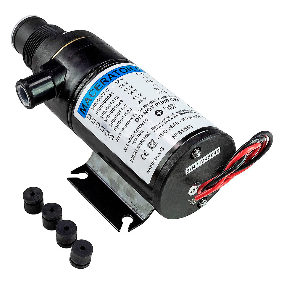 Мацераторная (измельчающая) самовсасывающая помпа для откачки содержимого фекальной цистерны. Высокая производительность и напор позволяют опорожнять цистерну как в специальные емкости на берегу, так и в танки обслуживающего судна. Корпус измельчителя изготовлен из бакелита. Откачивающая крыльчатка — резиновая.