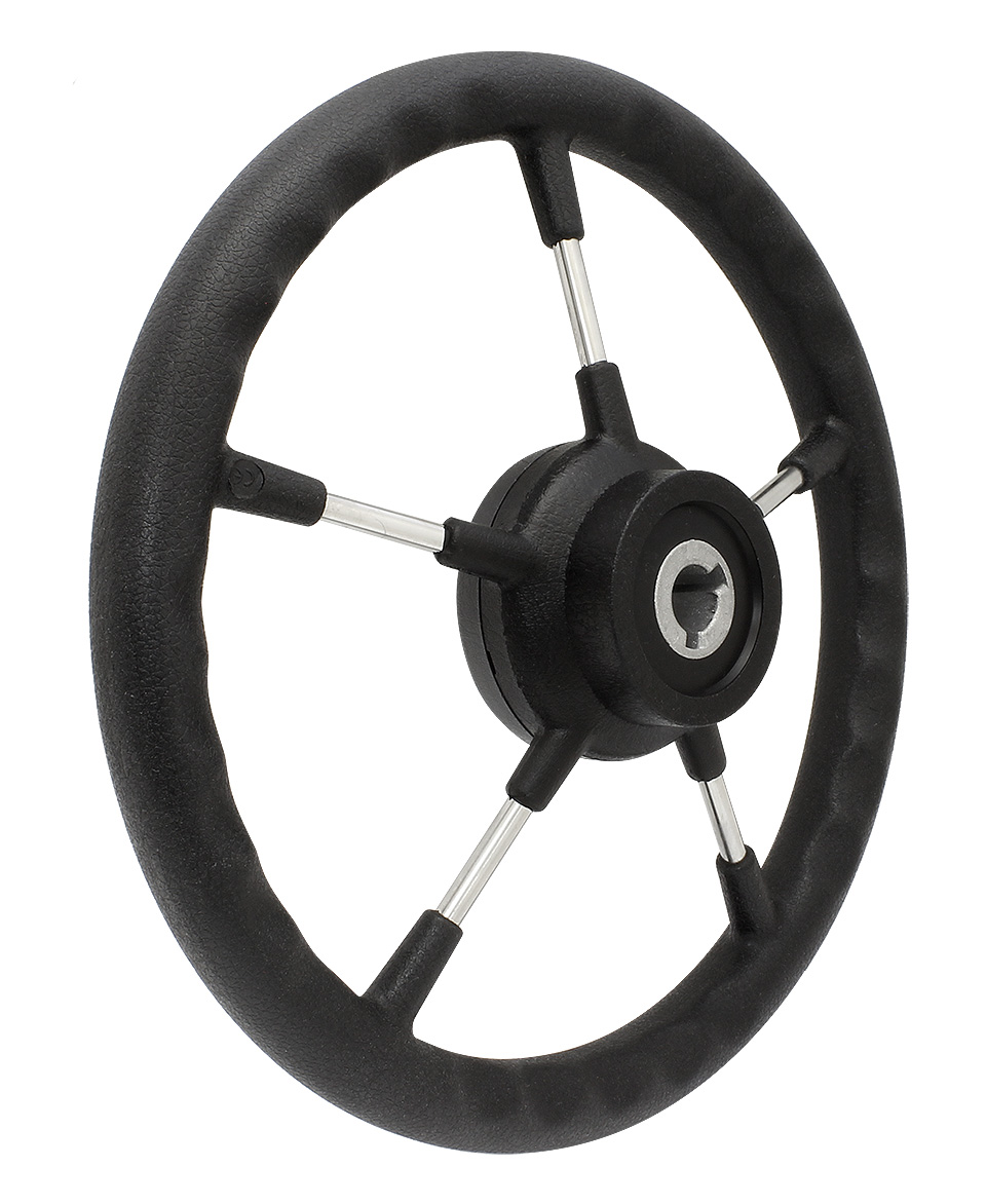 Рулевое колесо с полированными нержавеющими спицами. Обод диаметром 320 или 360 мм покрыт прочной полиуретановой оболочкой черного цвета. Ступица круглой формы имеет посадочный конус стандартного размера.