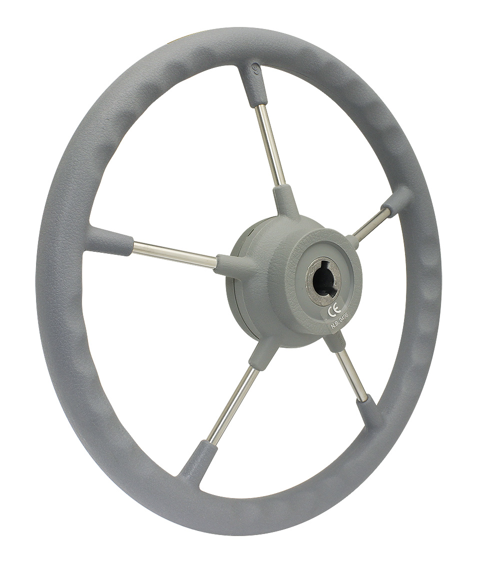 Рулевое колесо с полированными нержавеющими спицами. Обод диаметром 320 или 360 мм покрыт прочной полиуретановой оболочкой черного цвета. Ступица круглой формы имеет посадочный конус стандартного размера.
