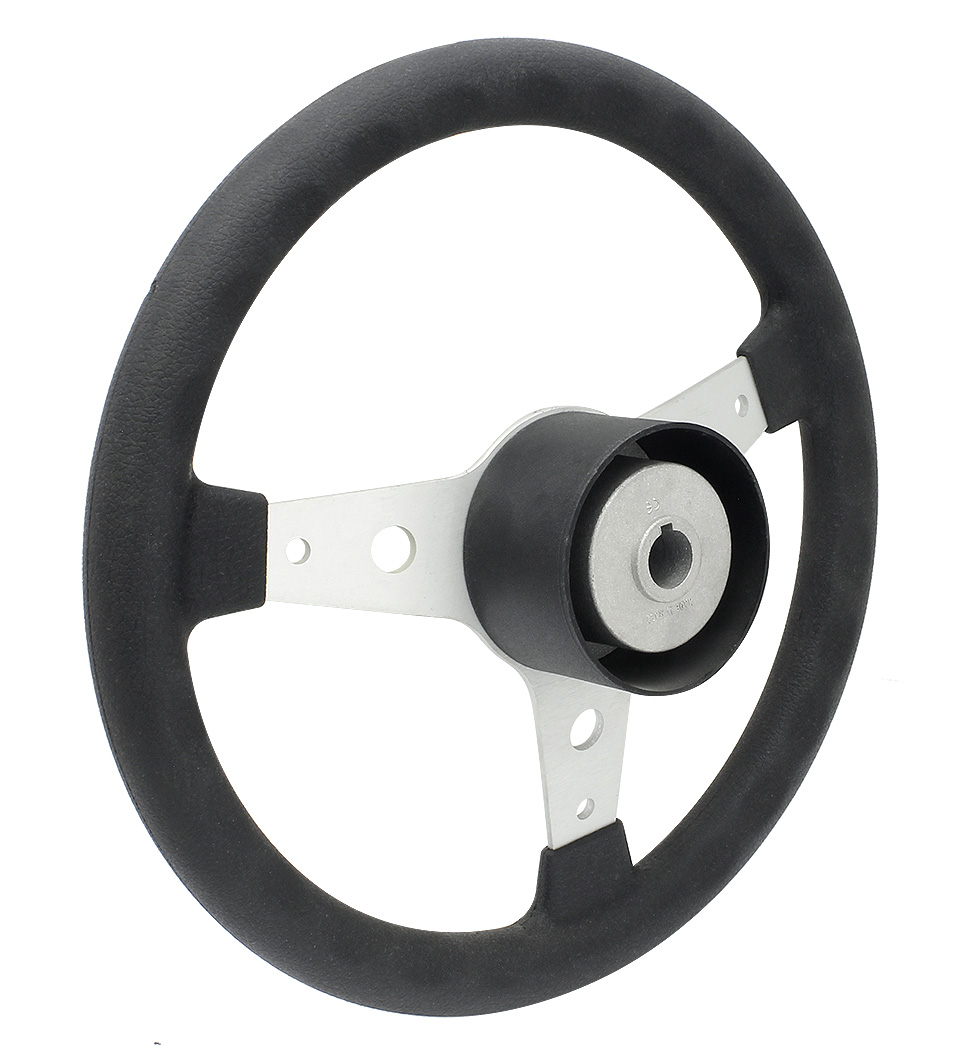 Рулевое колесо с мягким полиуретановым ободом диаметром 310 или 340 мм и анодированными (либо серебристыми) спицами. Ступица круглой формы имеет посадочный конус стандартного размера.