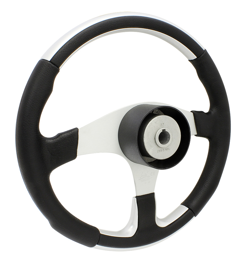 Рулевое колесо со ступицей из легкого сплава и утолщенным ободом диаметром 355 мм с серебристыми, карбоновыми, вересковыми и синими вставками. Ступица круглой формы имеет посадочный конус стандартного размера.