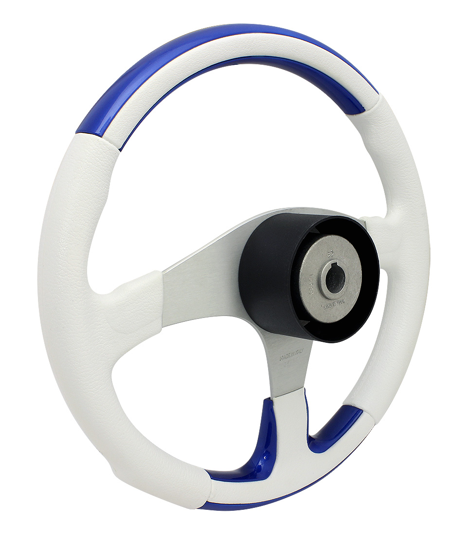 Рулевое колесо со ступицей из легкого сплава и утолщенным ободом диаметром 355 мм с серебристыми, карбоновыми, вересковыми и синими вставками. Ступица круглой формы имеет посадочный конус стандартного размера.