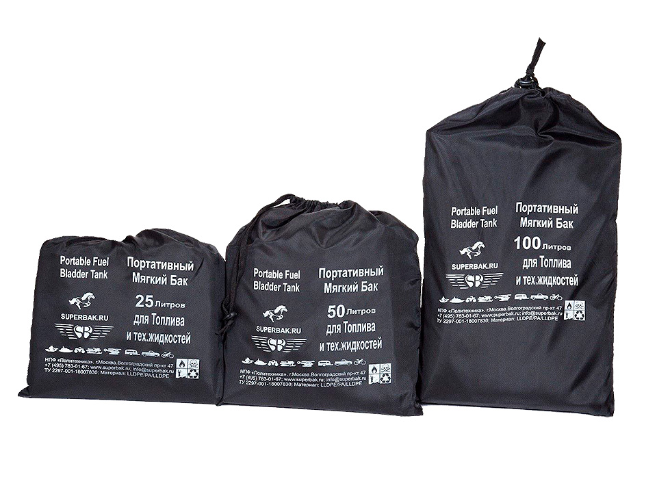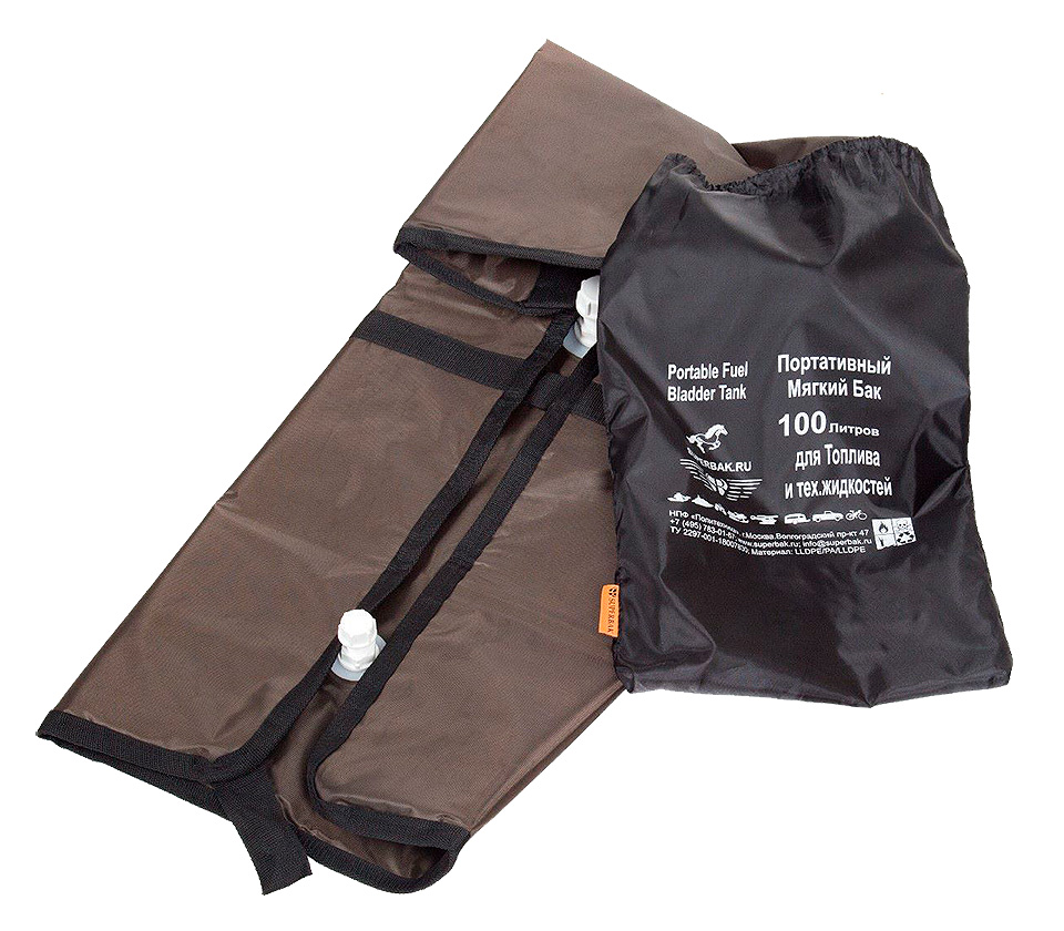 Мягкие (эластичные) баки для хранения и перевозки топлива. Также могут использоваться в качестве емкостей для питьевой воды (только новые баки без следов топлива!). Состоят из внутренней герметичной полимерной емкости и внешней силовой тканевой оболочки. Имеют стропы для крепления, петли для переноски, заливные горловины с резьбовыми крышками и расходные патрубки с шаровыми кранами. Могут использоваться при температуре от –50°С до +50°С (для хранения и перевозки топлива) или от +4°С до +50°С (для хранения и перевозки воды). Могут быть установлены на палубах, в трюмах, под банками, пайолами, между шпангоутами, в полости борта и в других обычно неиспользуемых для хранения жидкостей объемах маломерных речных и морских судов, а также в качестве стационарного/передвижного топливного резервуара.