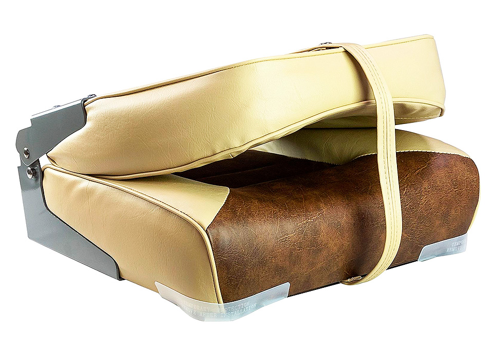 Мягкое сиденье со складной спинкой. Обивка из винила, устойчивого к воздействию влаги и ультрафиолета и не впитывающего жидкостей.