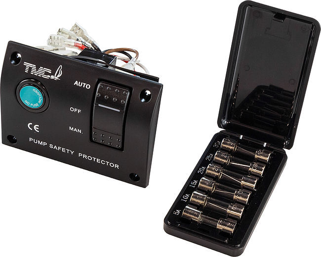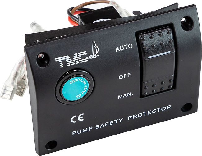 Панель управления, включающая двухпозиционный клавишный выключатель, позволяющий включить помпу вручную или перевести ее в режим автоматической работы (для неавтоматических помп потребуется приобретение поплавкового выключателя). Снабжена гнездом под плавкий предохранитель и реле подключения нагрузки, рассчитанное на ток 40А. Внимание! Если выбранная вами трюмная помпа потребляет ток силой 10 А или выше, подключение поплавкового выключателя к ней следует проводить только через данную панель управления. Для остальных помп панель является опцией, обеспечивающей дополнительную надежность.