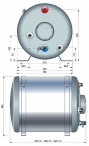 Судовой бойлер. Позволяет нагревать воду с помощью ТЭНа (мощностью 500 либо 1200 Вт) от электросети напряжением 220 В, либо от системы охлаждения двигателя (горячий антифриз поступает в теплообменник, 3-метровую нержавеющую спираль, где отдает тепло нагреваемой воде). Поставляется в различных вариантах: с двойным нагревом (с теплообменником - от двигателя и ТЭНом - от сети 220 В), только с теплообменником, либо только с ТЭНом. Бак для воды и внешний корпус изготовлены из нержавеющей стали. Теплоизоляция выполнена из полиуретановой пены. В стандартную комплектацию входит предохранительный невозвратный клапан, обеспечивающий постоянное наполнение бойлера водой и защиту от избыточного давления (он же позволяет спустить воду перед зимним хранением). Максимальная температура нагрева от сети 220 В регулируется с помощью термостата в пределах 40-80 градусов Цельсия (заводская настройка – 60 градусов). Максимальная температура нагрева от системы охлаждения двигателя зависит от интенсивности работы двигателя и настроек термостата его штатной системы охлаждения. Максимальное давление воды в баке: 6 Bar. Производитель: «Quick», Италия.