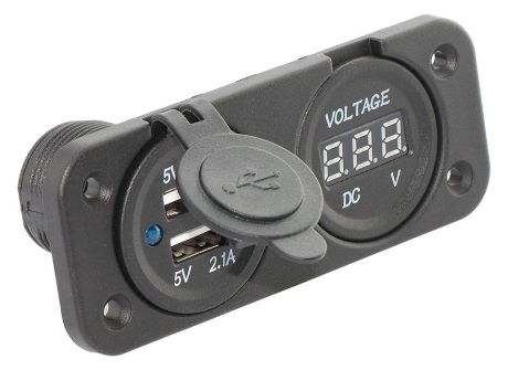 Два зарядных гнезда USB и цифровой вольтметр, объединенные в одной пластиковой панели. Могут также устанавливаться отдельно без панели.
