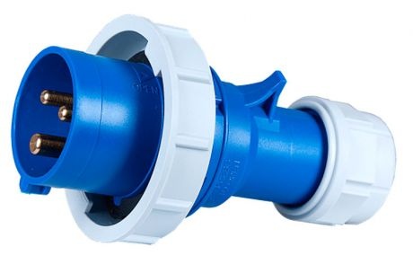 Вилка с водонепроницаемым резьбовым фланцем. Водонепроницаемая по стандарту IP67 (с фланцем, навернутым на ответную резьбовую часть на розетке). 3 контакта цилиндрической формы. Для монтажа на кабель.