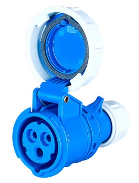 Розетка брызгозащищенная, врезаемая. Водонепроницаемая по стандарту IP67 (с закрытой крышкой). 3 контакта цилиндрической формы. Для монтажа на кабель.