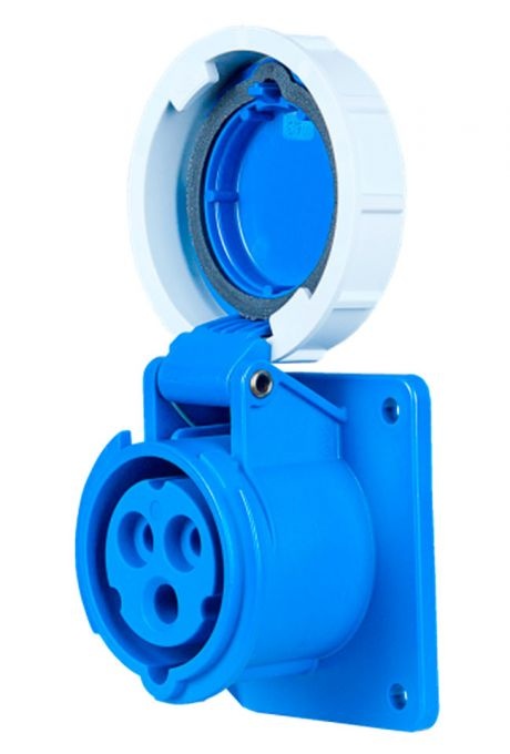 Розетка брызгозащищенная, врезаемая. Водонепроницаемая по стандарту IP67 (с закрытой крышкой). 3 контакта цилиндрической формы. Врезаемая в плоскость конструкция.