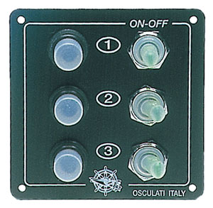 Тумблеры со светодиодной индикацией и водонепроницаемыми силиконовыми колпачками. Верхний тумблер — трехпозиционный. Средний — двухпозиционный с фиксацией. Нижний — двухпозиционный с возвратной пружиной. Каждая цепь защищена автоматическим предохранителем с аналогичным силиконовым колпачком (15 ампер).