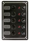 Новинка! Черное алюминиевое основание. 5 или 6 тумблеров, защищенных резиновыми колпачками. Светодиодные индикаторы включения. Гнезда под плавкие предохранители.