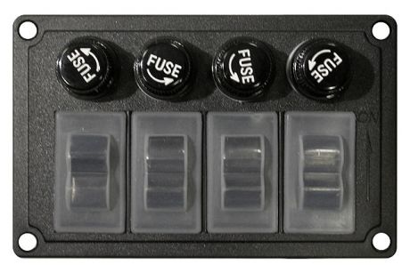 Новинка! Панель с четырьмя клавишными выключателями, защищенными от попадания брызг силиконовыми колпачками и четырьмя гнездами под плавкие предохранители.