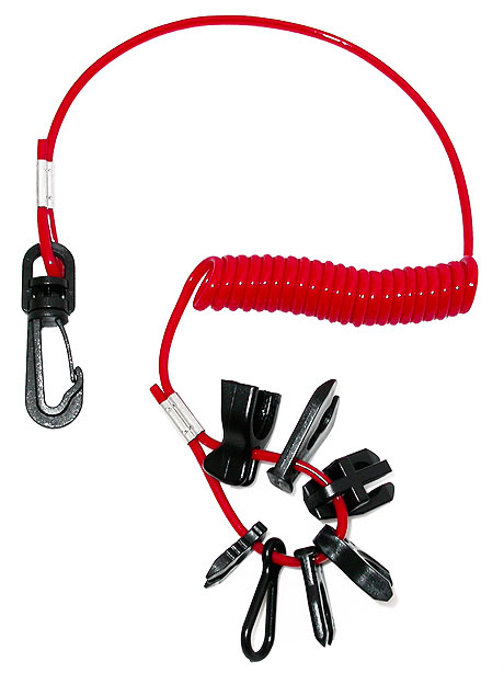 Включает витой шнур с карабином и набором из семи пластиковых ключей для аварийных выключателей моторов следующих марок: