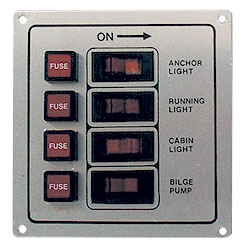 Алюминиевая панель с четырьмя крепежными отверстиями по периметру. 4 плавких предохранителя. 4 клавишных выключателя с подсветкой и табличками: «anchor light» (стояночный огонь), «running light» (ходовые огни), «cabin light» (освещение рубки), «bilge pump» (трюмная помпа).