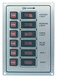 Алюминиевая панель с шестью крепежными отверстиями по периметру. Шесть плавких предохранителей. Шесть клавишных выключателей с подсветкой и табличками: «anchor light» (стояночный огонь), «running light» (ходовые огни), «cabin light» (освещение рубки), «bilge pump» (трюмная помпа), «aux 1» (вспомогательный 1), «aux 2» (вспомогательный 2).