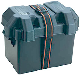 Вентилируемый бокс для аккумулятора из полипропилена. Снабжен удобными рукоятками со скругленными кромками и прочным ремнем, рассчитанным на 150-килограммовую нагрузку. Не подвержен действию кислот. Защищает аккумулятор от брызг, а трюм – от коррозии под действием вытекшего электролита.