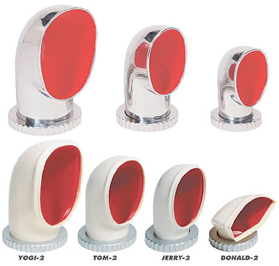 Дефлекторные головки четырех типоразмеров. Изготавливаются из нержавеющей стали (внутренняя часть красная или белая) либо эластичного поливинилхлорида (внутренняя часть красная). Легко снимаются, а также поворачиваются вокруг оси. Фиксируются затяжкой накидной гайки. Все модели могут использоваться совместно с защитными блоками, предотвращающими попадание воды внутрь корпуса судна (приобретаются отдельно), а также противомоскитными сетками и крышками, закрывающими раструб дефлектора снаружи. Производитель: «Vetus», Голландия.