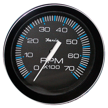 Тахометр для бензиновых двигателей. Стойкое к царапинам стекло. Черный циферблат с белыми цифрами, синими делениями и подсветкой по периметру. Белая стрелка с силиконовым демпфером, гасящим вибрацию и предотвращающим дрожание. Экранированная конструкция для защиты от электромагнитных помех.
