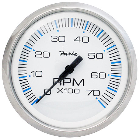 Тахометр для бензиновых двигателей. Стойкое к царапинам стекло. Белый циферблат с черными цифрами, ободом из полированной нержавеющей стали и подсветкой по периметру. Черная стрелка с силиконовым демпфером, гасящим вибрацию и предотвращающим дрожание. Экранированная конструкция для защиты от электромагнитных помех.