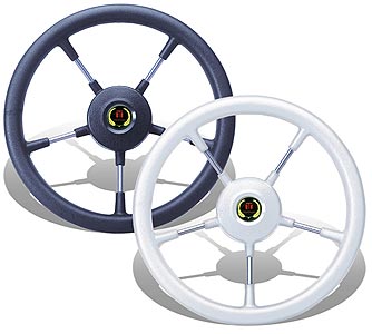 Рулевое колесо с полированными нержавеющими спицами. Обод диаметром 320 или 360 мм покрыт прочной полиуретановой оболочкой черного цвета. Ступица круглой формы имеет посадочный конус стандартного размера.