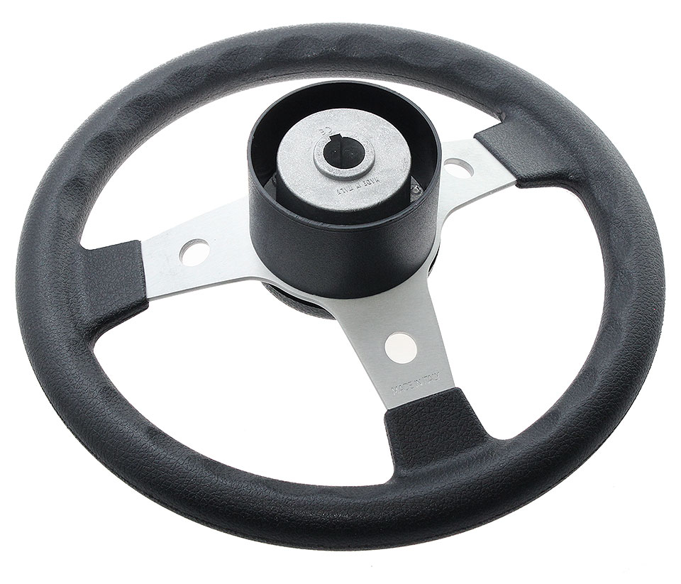 Пластиковое рулевое колесо с мягким ободом диаметром 310 мм. Спицы изсеребристого алюминия.