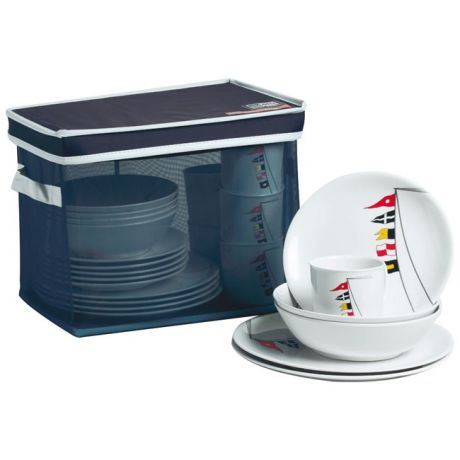 Набор посуды из меламина — стойкого к ударам и царапинам керамоподобного пластика. 6 плоских тарелок, 6 суповых мисок, 6 десертных мисок, 6 кружек. Цена за набор.