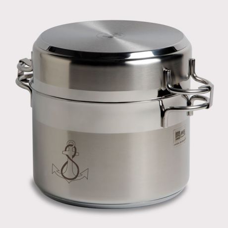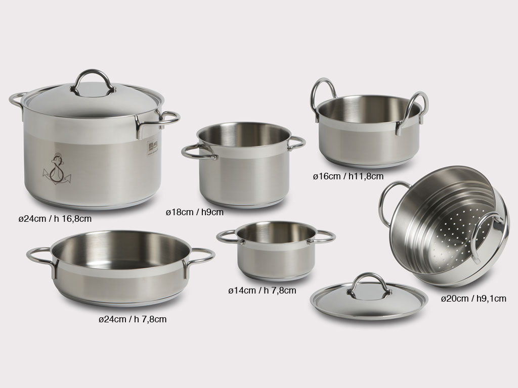 Уникальный набор посуды, занимающий минимальный объем на камбузе! Все 8 предметов помещаются для хранения внутрь самой большой кастрюли и надежно запираются металлическими защелками. Посуда изготовлена из качественной нержавеющей стали.