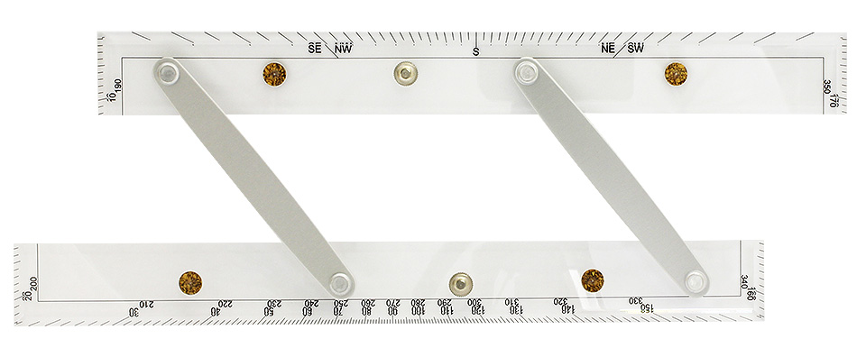 Пантографная линейка (две параллельных линейки, соединенных рычагами) с гониометром (прибор для измерения углов) из прозрачного пластика. Позволяет передвигать линейки друг относительно друга поперек карты без изменения угла между ними. Применяется в штурманских работах.